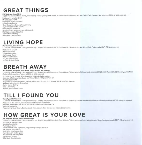 Acoustic Guitar [Acoustic Guitars] Phil Wickham | Backing Vocals [BGV] North Coast Worship | Bass, Drum Programming [Programming] Chad Carouthers | Drum Programming [Programming], Keyboards Jonathan Smith (4) | Drums Casey Brown (3) | Edited By [Editing] John DeNosky | Electric Guitar [Electric Guitars] Taylor Johnson | Engineer [Engineered By] Buckley Miller | Keyboards David Ramirez (7) | Mixed By Sean Moffitt | Producer [Produced By] Jonathan Smith (4) | Written-By Jonas Myrin, Phil Wickham