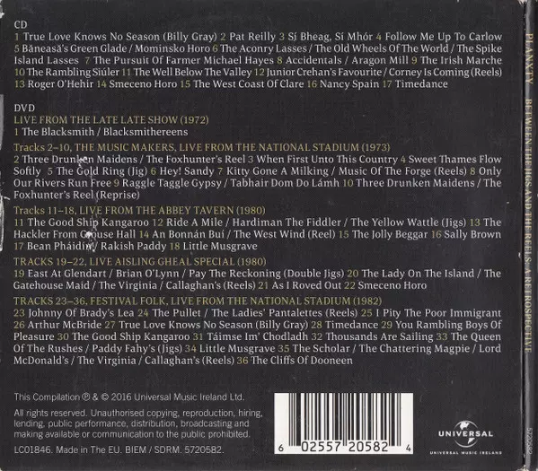 Planxty: Between The Jigs And The Reels: A Retrospective versione su CD/DVD in standard edizione. Questa particolare edizione è stata pubblicata in Irlanda nella casa editrice Universal Music Ireland in data 22. aprile 2019. Album comprende generi Folk, World, & Country, Folk e Musica celtica.