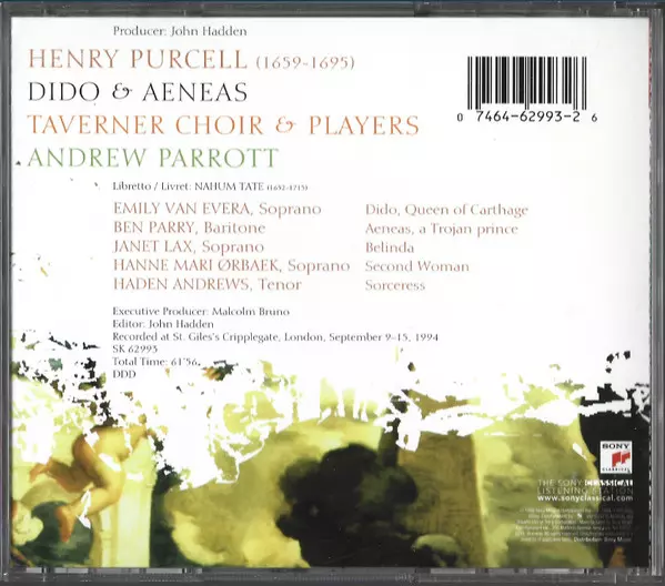 | Artista | Henry Purcell | Andrew Parrott | Taverner Players | Taverner Choir | Ben Parry | Emily Van Evera |