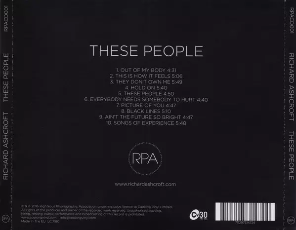 Richard Ashcroft: These People versione su CD in standard edizione. Questa particolare edizione è stata pubblicata in Europa e Regno Unito nella casa editrice Righteous Phonographic Association in collaborazione con Cooking Vinyl in data 20. maggio 2016. Album comprende generi Rock, Pop, Indie-Pop e Brit Pop.