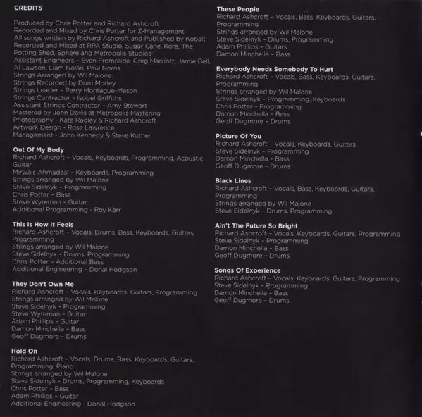 Arranged By [Strings] Wil Malone | Bass Christopher Marc Potter | Drums, Programmed By [Programming], Keyboards Steve Sidelnyk | Engineer [Additional Engineering] Donal Hodgson | Guitar Adam Phillips | Vocals, Drums, Bass, Keyboards, Guitar, Programmed By [Programming], Piano Richard Ashcroft