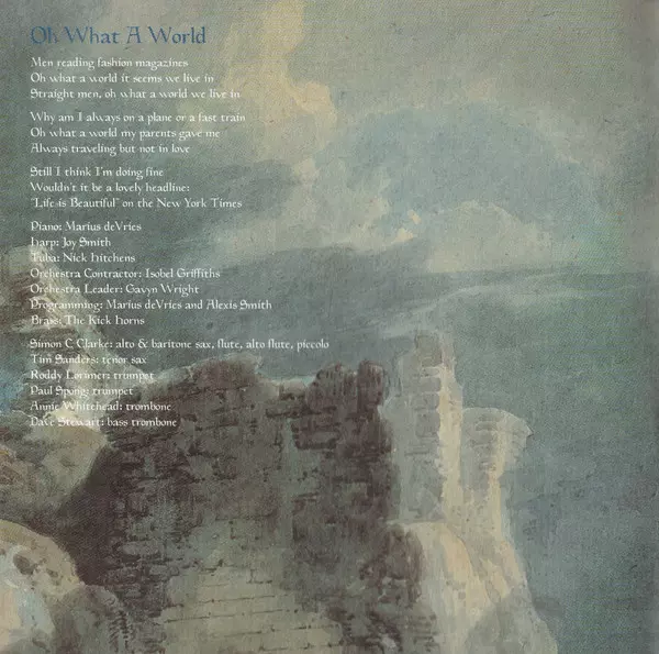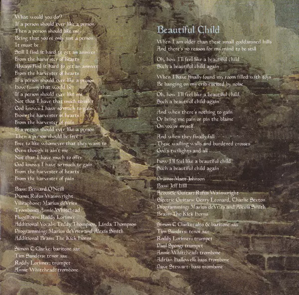 Baritone Saxophone Simon Clarke (2) | Bass Bernard O'Neill | Brass [Additional] The Kick Horns | Flugelhorn, Trumpet Roddy Lorimer | Piano Rufus Wainwright | Programmed By Alexis Smith, Marius de Vries | Tenor Saxophone Tim Sanders | Trombone Annie Whitehead | Vibraphone Marius de Vries | Vocals [Additional] Linda Thompson, Teddy Thompson