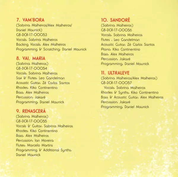 Acoustic Guitar Zé Carlos Santos | Bass Alex Malheiros | Electric Piano [Rhodes] Kiko Continentino | Percussion Jakaré Garcia | Programmed By [Programming] Daniel Maunick | Saxophone [Sax], Flute [Flutes] Leo Gandelman | Vocals Sabrina Malheiros | Written-By Sabrina Malheiros