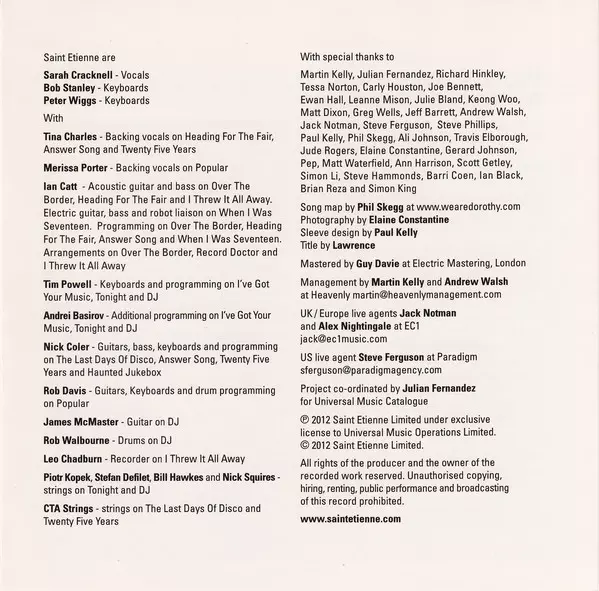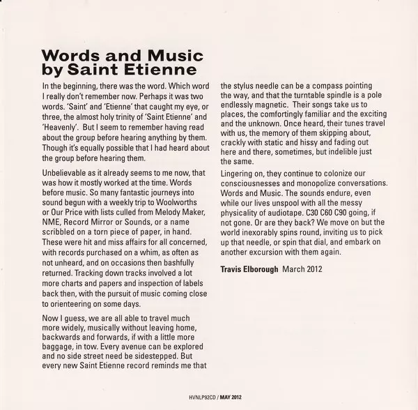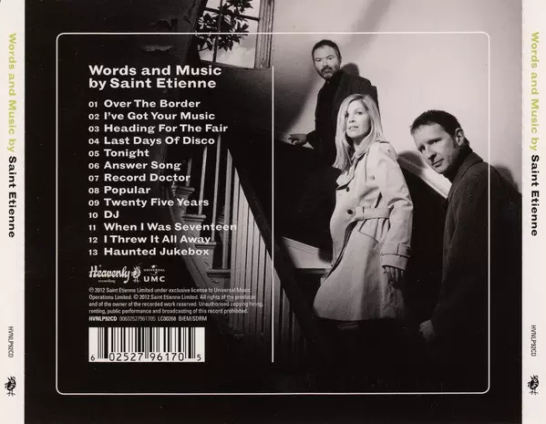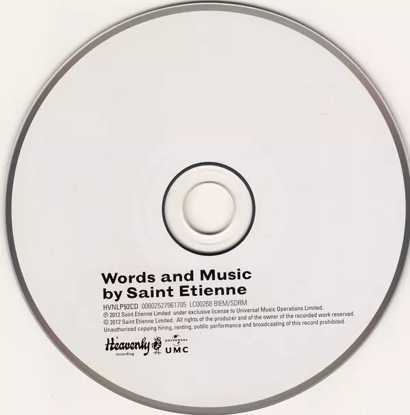 Saint Etienne: Words And Music By Saint Etienne versione su CD in standard edizione. Questa particolare edizione è stata pubblicata in Europa e Regno Unito nella casa editrice Heavenly in collaborazione con Universal UMC in data 31. maggio 2012. Album comprende generi Pop, Musica elettronica, Indie-Pop, Synth-Pop, Nu-Disco e Electro House.