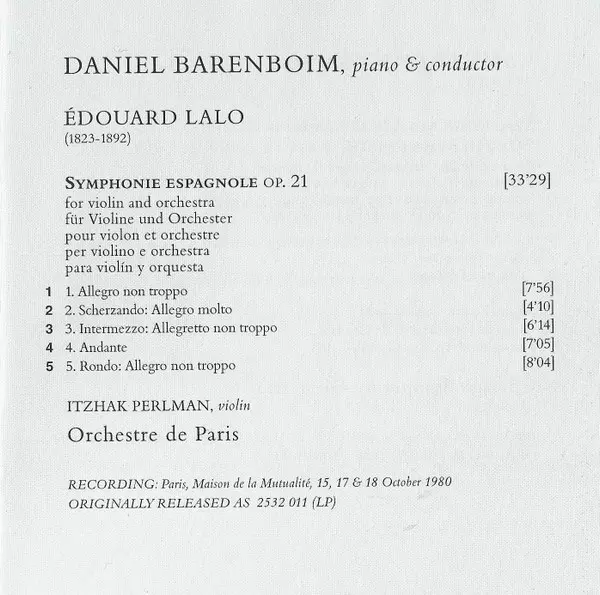 | Composed By Édouard Lalo | Conductor Daniel Barenboim | Orchestra Orchestre De Paris | Violin Itzhak Perlman | ||