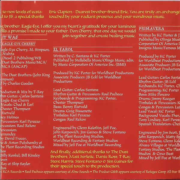 | Bass Benny Rietveld | Congas Paul Rekow | Drums Rodney Holmes | Engineer Jeff Poe, Jim Gaines, John Karpowich, Steve Fontano | Engineer [Assistant] Michael Anderson (3) | Keyboards Chester Thompson (2) | Mixed By Jeff Poe | Percussion, Vocals Karl Perazzo | Producer, Guitar, Bells [Sleigh] Carlos Santana | Producer, Programmed By, Accordion, Vocals KC Porter | Trombone Mic Gillette, Ramon Flores | Trumpet Jose Abel Figueroa, Marvin McFadden, Mic Gillette | Vocals Tony Lindsay | Written-By Carlos Santana, Rachid Taha, Tony Lindsay | |||