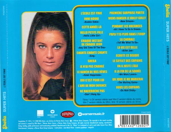 Sheila: Super Hits (L'École Est Finie) versione su CD in standard edizione. Questa particolare edizione è stata pubblicata in Francia nella casa editrice Wea Music in data 16. marzo 2010. Album comprende generi Rock, Pop e Yé-Yé.