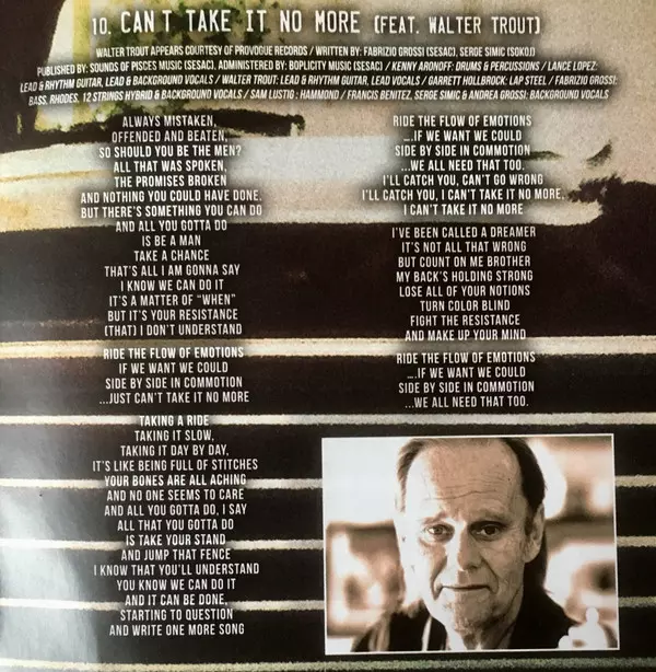 Backing Vocals [Background Vocals] Andrea Grossi (2), Francis Benitez, Srđan Simić - Kamba | Bass, Electric Piano [Rhodes], Twelve-String Guitar [12-Strings Hybrid], Backing Vocals [Background Vocals] Fabrizio Grossi | Drums, Percussion [Percussions] Kenny Aronoff | Electric Organ [Hammond] Sam Lustig | Featuring [Feat.] Walter Trout | Lap Steel Guitar [Lap Steel] Garrett Hollbrock | Rhythm Guitar, Lead Guitar, Lead Vocals Walter Trout | Rhythm Guitar, Lead Guitar, Lead Vocals, Backing Vocals [Background Vocals] Lance Lopez | Written-By Fabrizio Grossi, Srđan Simić - Kamba