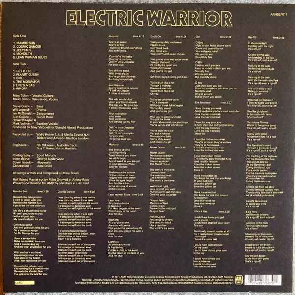 Druhé studiové album britské skupiny T.Rex z roku 1971 je klasikou. Jedním ze dvou singlů byla skladba "Get It On, T.Rex", nejprodávanější singl všech dob a jediný titul skupiny v první desítce v USA. "Electric Warrior" udělal z Marca Bolana přes noc hvězdu glam rocku. Vytvořil trend, který brzy následovali David Bowie, Roxy Music a Mott the Hoo...