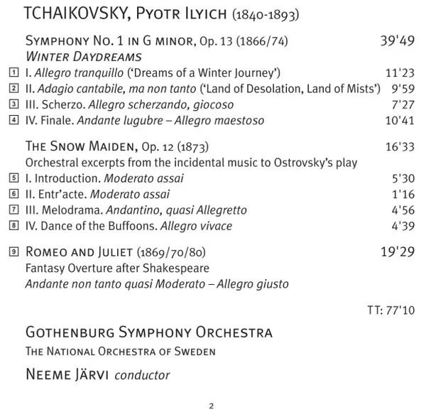 | Artista | Pyotr Ilyich Tchaikovsky | Neeme Järvi | Göteborgs Symfoniker |