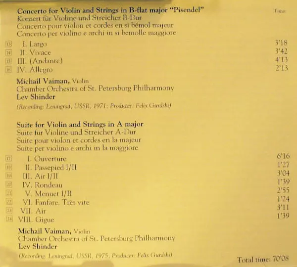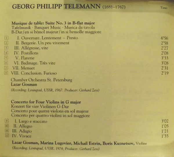 | Artista | Georg Philipp Telemann | Leningrad Chamber Orchestra | Lazar Gosman | Камерный Оркестр Ленинградской Филармонии | Лев Шиндер |
