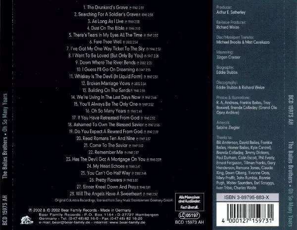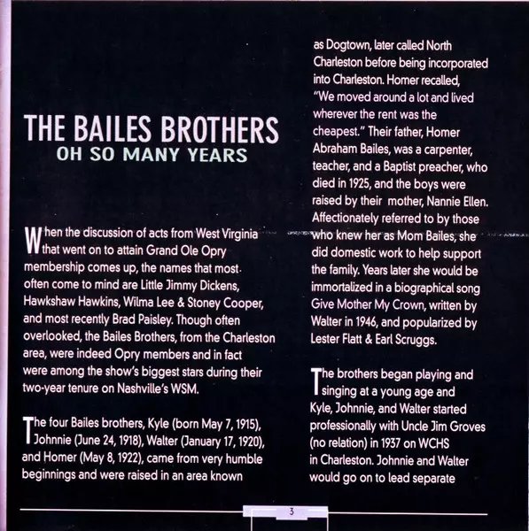 Bailes Brothers: Oh So Many Years versione su CD in standard edizione. Questa particolare edizione è stata pubblicata in Germania nella casa editrice Bear Family Records in data 12. novembre 2002. Album comprende generi Folk, World, & Country, Country, Hillbilly e Gospel.