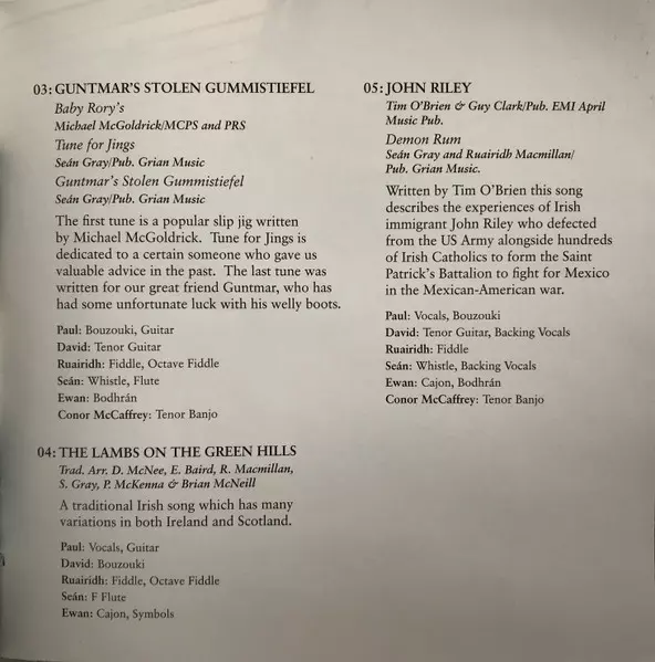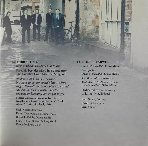 Bodhrán Ewan Baird | Bouzouki David McNee | Fiddle Rua MacMillan | Flute Sean Gray (3) | Vocals, Guitar Paul McKenna (9) | Written-By Lionel McClelland