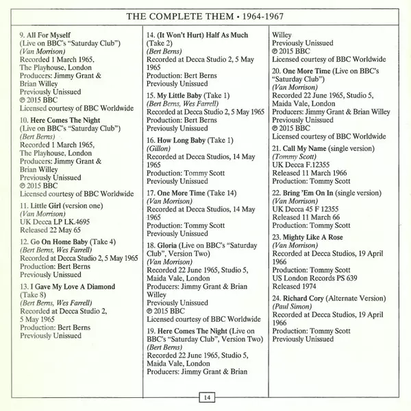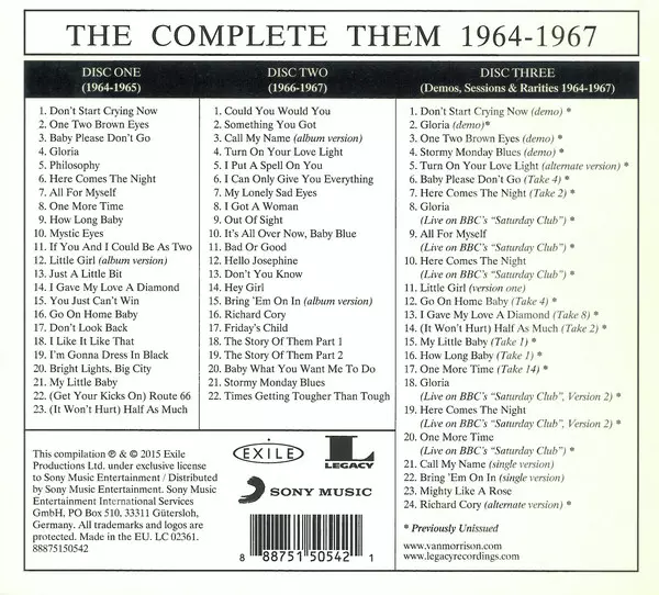 Them: The Complete Them 1964-1967 versione su 3CD in standard edizione. Questa particolare edizione è stata pubblicata in Europa nella casa editrice Legacy in collaborazione con Exile e Sony Music in data 4. dicembre 2015. Album comprende generi Rock, Beat e Blues-Rock. 1964 1967.