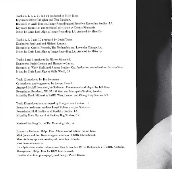 Acoustic Guitar Dean Parks, Rene Toledo | Backing Vocals Alex Brown, Claytoven Richardson, Conesha Owens, Jeanie Tracy, Kitty Beethoven, Sandy Griffith, Skyler Jett, Tina Arena | Bass Nathan East | Coordinator [Production] Barbara Stout | Drums John Robinson (2) | Electric Guitar Michael Landau | Engineer David Gleeson, Humberto Gatica | Engineer [Assistant] Greg Bieck, Kyle Bess, Pete Krawiec, Stuart Brawley, Tony Rambo | Keyboards [Additional], Synthesizer, Programmed By [Additional], Sound Designer Dan Shea | Keyboards, Synthesizer, Drum Programming [Additional], Programmed By Walter Afanasieff | Mixed By Mick Guzauski | Mixed By [Assistant] Tom Bender | Percussion Paulinho Da Costa | Producer, Arranged By Walter Afanasieff | Recorded By David Reitzas, Jay Healy, Jeffrey 'Woody' Woodruff | Written-By Pam Reswick, Steve Werfel, Tina Arena