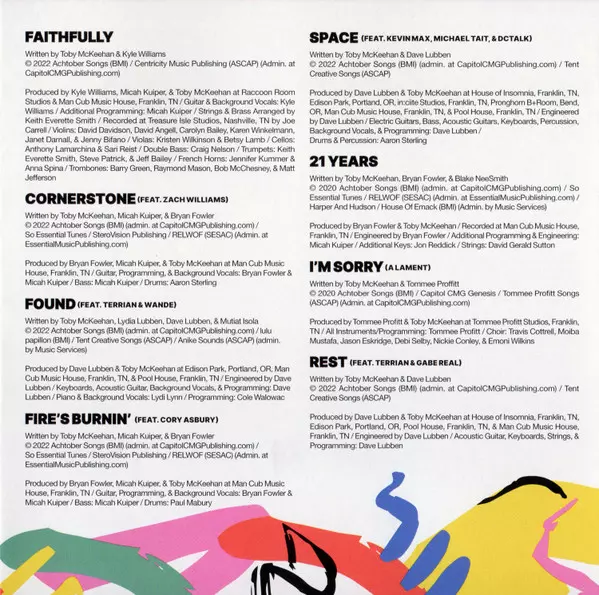 Arranged By [Strings & Horns] Keith Everette Smith | Backing Vocals Bryan Fowler, Kyle Williams (8) | Cello Anthony Lamarchina, Sarighani Reist | Double Bass Craig Nelson | Engineer Doug Sarrett | Featuring Marlee McKeehan | Mastered By Chris Gehringer | Mixed By Nick Rad | Producer Bryan Fowler, Kyle Williams (8), Toby McKeehan | Recorded By [Strings] Joe Carrell | Tenor Saxophone, Baritone Saxophone Tyler Summers | Trombone Barry Green | Trumpet Keith Everette Smith, Steve Patrick (2) | Viola Betsy Lamb, Kristin Wilkinson | Violin Carolyn Bailey, David Angell, David Davidson, Janet Darnall, Jenny Bifano, Karen Winkelmann | Written-By Jon Reddick, Marlee McKeehan, Toby McKeehan