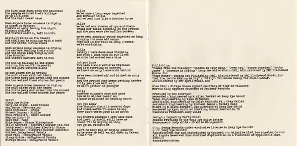 Backing Vocals James Quine, Mireya Ramos, Shae Fiol | Bass Dave Roe | Drums Gene Chrisman | Electric Guitar, Acoustic Guitar, Backing Vocals Dan Auerbach | Electric Guitar, Percussion [Tik-Tak] Billy Sanford | Electric Piano [Wurlitzer] Bobby Wood | Fiddle Stuart Duncan | Lead Vocals Tony Joe White | Organ [B3] Raynier Jacildo | Percussion Sam Bacco | Piano, Vibraphone Mike Rojas | Steel Guitar Paul Franklin