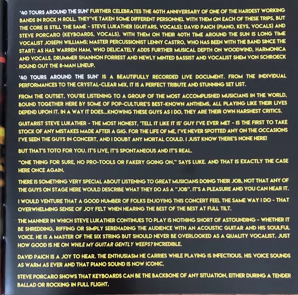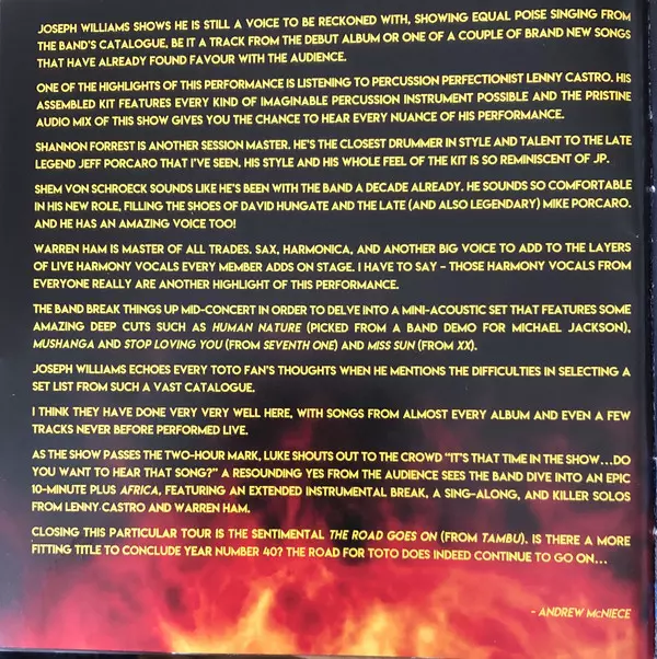 A thrilling live performance by Toto On the occasion of last year's 40th birthday, Toto dared to look back and presented "Greatest Hits: 40 Trips Around The Sun", a best-of album with a number of classic and unreleased songs. Now in 2019, a live version is coming: here is "40 Tours Around The Sun". This is a new live album and concert film. The ...