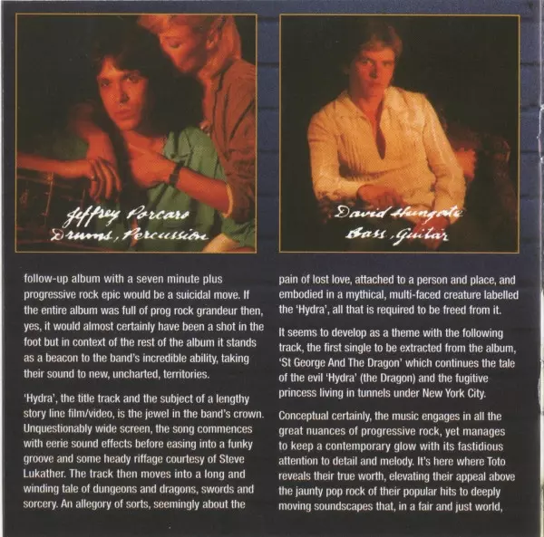 When Toto returned with their second album "Hydra", originally released in 1979, fans and critics alike were confronted with a body of work that, while instantly recognizable, was much more advanced and complex. Instead of serving up another serving of stylish pop-rock, they dug deep within themselves and devoted themselves to elaborate composit...
