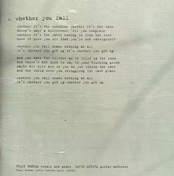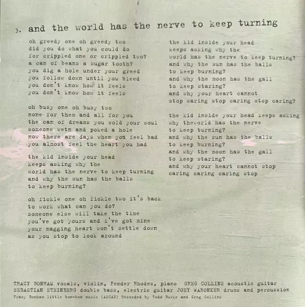 Acoustic Guitar Greg Collins | Double Bass, Electric Guitar Sebastian Steinberg | Drums, Percussion Joey Waronker | Vocals, Violin, Electric Piano [Fender Rhodes], Piano Tracy Bonham