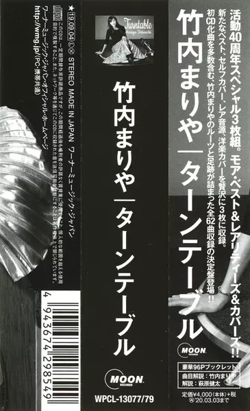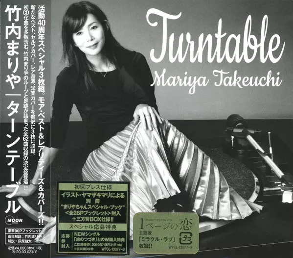 Mariya Takeuchi: Turntable = ターンテーブル DLX | LTD versione su 3CD in deluxe limitati edizione. Questa particolare edizione è stata pubblicata in Giappone nella casa editrice Moon Records (5) in data 13. settembre 2019. Album comprende generi Rock, Pop, Folk, World, & Country, Musica elettronica, Blues, Jazz, Funk / Soul, Ballata, Synth-Pop, Soul, Funk, Disco, Jazz-Funk, Kayōkyoku, Soft Rock, AOR, Boogie e City Pop.