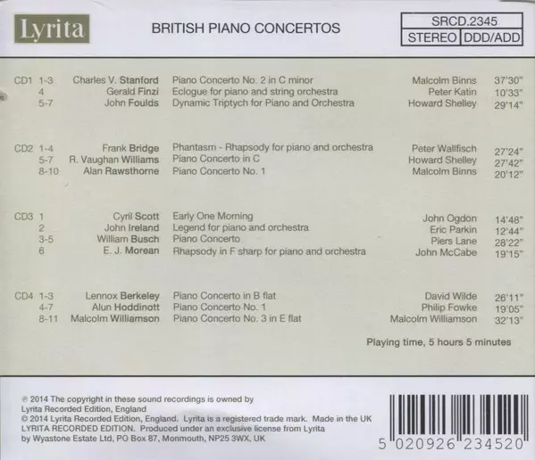 Various: British Piano Concertos versione su 4CD in standard edizione. Questa particolare edizione è stata pubblicata in REGNO UNITO nella casa editrice Lyrita Recorded Edition in data 27. ottobre 2014. Album comprende generi Musica classica, Modernism e Il romanticismo.