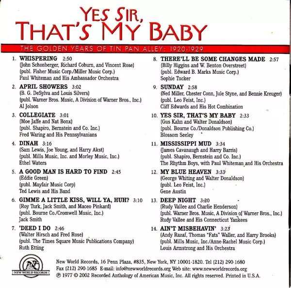 Titolo | Yes Sir, That's My Baby (The Golden Years Of Tin Pan Alley 1920-1929) |