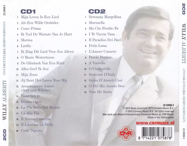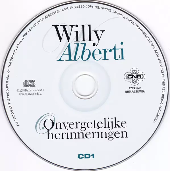 Willy Alberti: Onvergetelijke Herinneringen versione su 2CD in standard edizione. Questa particolare edizione è stata pubblicata in Paesi Bassi nella casa editrice Cnr in data 30. aprile 2015. Album comprende generi Pop e Vocale.