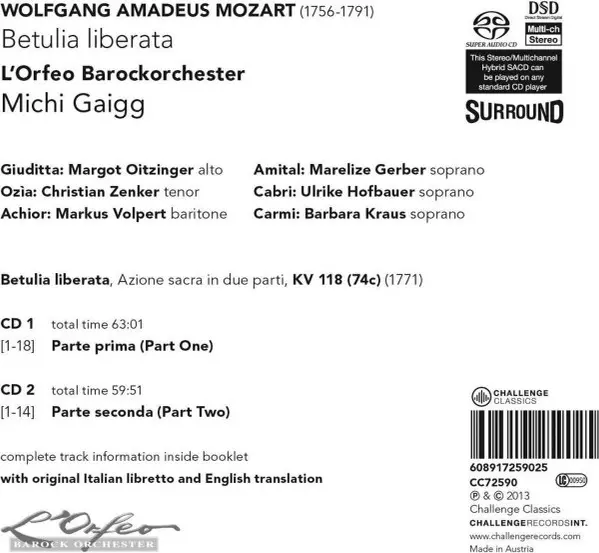 Wolfgang Amadeus Mozart: Betulia Liberata versione su 2SACD in standard edizione. Questa particolare edizione è stata pubblicata in Paesi Bassi nella casa editrice Challenge Classics in data 10. settembre 2013. Album comprende generi Musica classica e Oratorio. SACD.