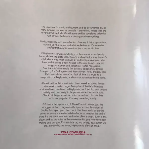 Ensemble, Alto Flute, Tenor Saxophone Tori Freestone | Ensemble, Alto Saxophone Helena Kay | Ensemble, Baritone Saxophone Gemma Moore | Ensemble, Bass Guitar Charlie Pyne | Ensemble, Drums Sophie Alloway | Ensemble, Electric Piano [Fender Rhodes] Alcyona Mick | Ensemble, Guitar Samuel Hällkvist | Ensemble, Percussion, Handclaps Corrina Silvester | Ensemble, Trombone Carol Jarvis | Ensemble, Trumpet Alex Ridout, Becca Toft | Ensemble, Trumpet, Flugelhorn, Handclaps Yazz Ahmed | Ensemble, Vibraphone Ralph Wyld | Performer [Improvisations: Invocation To Polyhymnia], Bass Guitar Charlie Pyne | Performer [Improvisations: Invocation To Polyhymnia], Drums Sophie Alloway | Performer [Improvisations: Invocation To Polyhymnia], Electric Piano [Fender Rhodes] Noel Langley | Performer [Improvisations: Invocation To Polyhymnia], Electric Violin Johanna Burnheart | Performer [Improvisations: Invocation To Polyhymnia], Flugelhorn Yazz Ahmed | Performer [Improvisations: Invocation To Polyhymnia], Guitar [Drone] Shirley Tetteh | Performer [Improvisations: Invocation To Polyhymnia], Guitar [High Guitars] Samuel Hällkvist | Soloist, Alto Saxophone [Cosmic Interlude] Camilla George | Soloist, Electric Piano [Fender Rhodes (Solo Response & Interaction 03:51 - 06:30)] Alcyona Mick | Soloist, Electric Piano [Fender Rhodes (Solo Transition 03:24 - 03:51)] Sarah Tandy | Soloist, Soprano Saxophone Tori Freestone | Soloist, Trumpet Yazz Ahmed