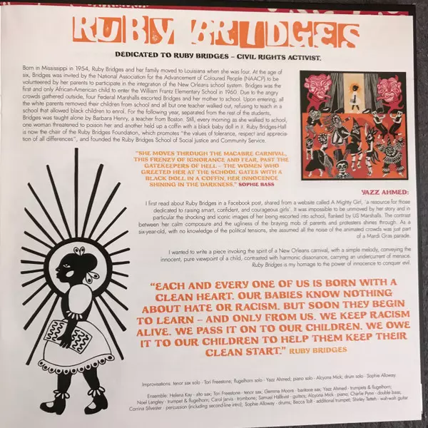 Ensemble, Alto Saxophone [Solo Melody Line], Voice Camilla George | Ensemble, Alto Saxophone, Voice Helena Kay | Ensemble, Baritone Saxophone Gemma Moore | Ensemble, Baritone Saxophone, Voice Josie Simmons | Ensemble, Double Bass, Voice Charlie Pyne | Ensemble, Drums, Voice Sophie Alloway | Ensemble, Guitar Samuel Hällkvist | Ensemble, Guitar [Additional Textures], Voice Shirley Tetteh | Ensemble, Percussion, Voice Corrina Silvester | Ensemble, Piano [Additional], Voice Sarah Tandy | Ensemble, Piano, Electric Piano [Fender Rhodes] Alcyona Mick | Ensemble, Tenor Saxophone Tori Freestone | Ensemble, Trombone, Voice Carol Jarvis | Ensemble, Trumpet Alex Ridout | Ensemble, Trumpet, Flugelhorn, Voice Yazz Ahmed | Ensemble, Voice Becca Toft, Johanna Burnheart, Noel Langley, Nubya Garcia, Rosie Turton, Sheila Maurice-Grey | Soloist [Improvisations], Flugelhorn Yazz Ahmed | Soloist [Improvisations], Piano [Coda] Sarah Tandy | Soloist [Improvisations], Piano [Introduction] Alcyona Mick | Words By Malala Yousafzai